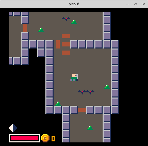 The final map is stored in a Lua table, exploiting the secret, hand-wavey 1MB of memory that the interpreter has available to it. This allows for a dungeon that is 128x128 tiles instead of the much smaller 128x32 available in the map. I could use up to 128x64 of the map, but my preference is for more enemies, objects, and tilesets, so I wanted to leave the second two sprite banks available.
