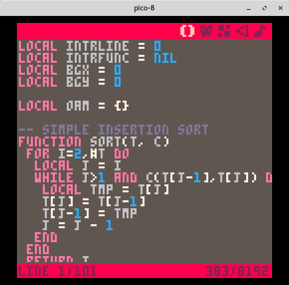 Inside of the callback, the user can move the background around and set the callback line. Unlike the actual Game Boy, they can also move OAMs around, which can lead to even more interesting effects. I implemented a very simple background scroller effect like you'd see in old demoscene demos and that's the extent of how much I toyed around with this. Rendering in this way eats up a ton of the virtual CPU that Pico-8 has (around half of it). A future version of this would probably want to be implemented using peek() and poke() to directly set memory, as that would be significantly faster. As it stands, I'm probably not going to touch this again for a long time/ever, so the code is up on itch.io with the demo.