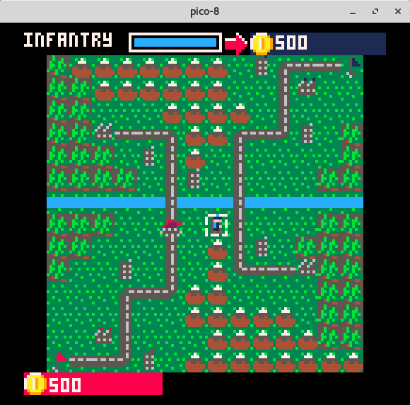 Pico Wars is a game inspired by the Advance Wars series of games. It's a tiny, turn-based war game where the objective is to capture the enemy headquarters. In Pico Wars, the player has access to three different units: the infantry, which captures buildings, the tank, a close-range unit, and the artillery, a long-range unit. There are three different types of buildings: the headquarters, which the player must defend, factories, which can produce units, and cities, which produce income every turn. There are also a variety of different terrain tiles that all have different movement costs for each unit, and some of which are impassable.
